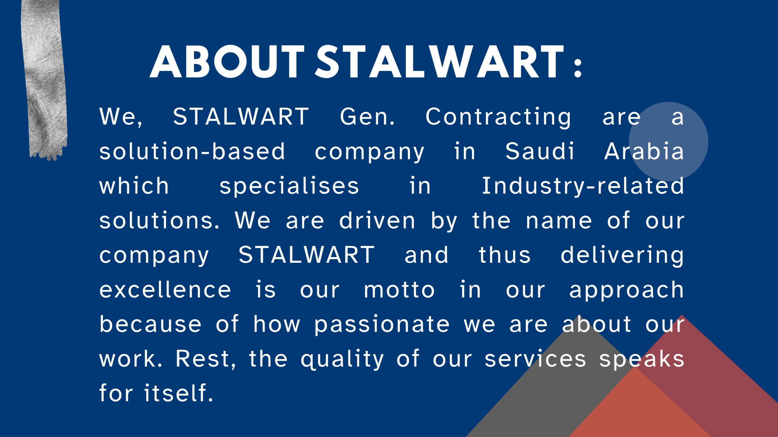 We, STALWART Gen. Contracting are a solution-based company in Saudi Arabia which specialises in Industry related solutions. We are driven by the name of our company STALWART and thus delivering excellence is our motto in our approach because of how passionate we are about our work. Rest, the quality of our services speaks for itself.