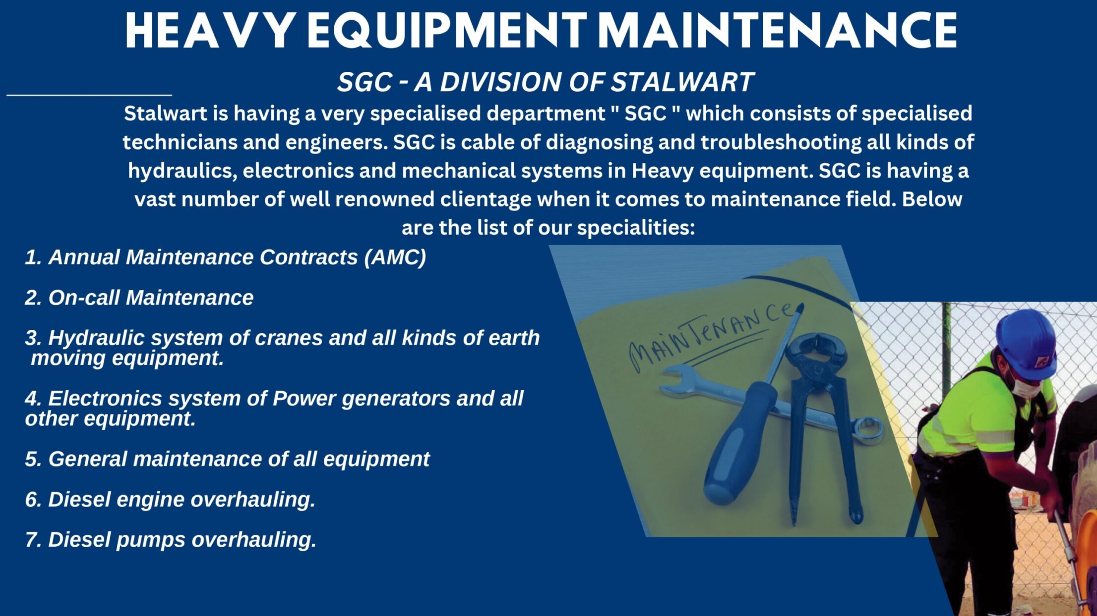 Stalwart Gen. Contracting is a responsive and flexible Company specialized in the Heavy Equipment Rentals, All kinds Of Porta Cabins, Rentals And Sales Heavy, Equipment Maintenance, Transportation And Logistics, Catering, Lifting, Fabrication and Civil works.